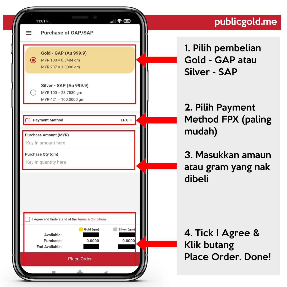 Pembelian gram emas GAP melalui app Public Gold menggunakan kaedah bayaran FPX seperti berikut:
